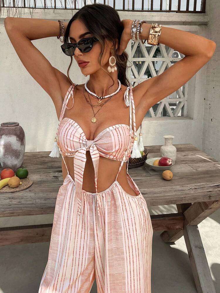 KARISMINA Women's Vacation Casual Striped Bandeau Top And Fringed Long Pants 2 Pieces Set Island Vacation Outfits
